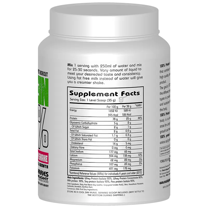 By combining fast- and slow-digesting proteins, 100% Protein helps keep your body in an anabolic, muscle-building state—promoting lean muscle growth, faster recovery, and enhanced performance.