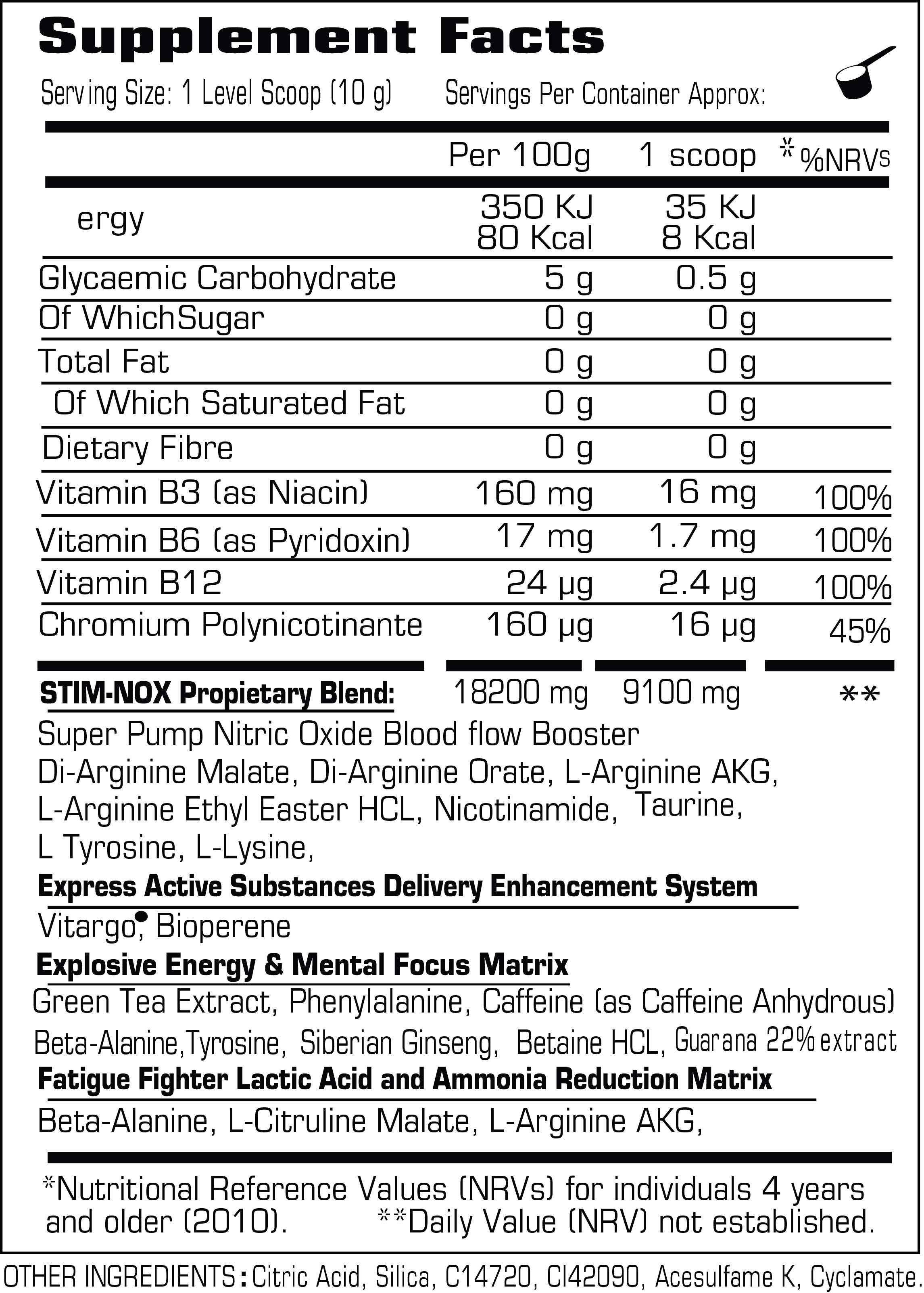 STIM NOX is a high-stimulant, nitric oxide-boosting pre-workout designed to maximize energy, focus, and muscle pumps—while delivering a potent thermogenic effect. Expect explosive, intense workouts that drive lean muscle gains.