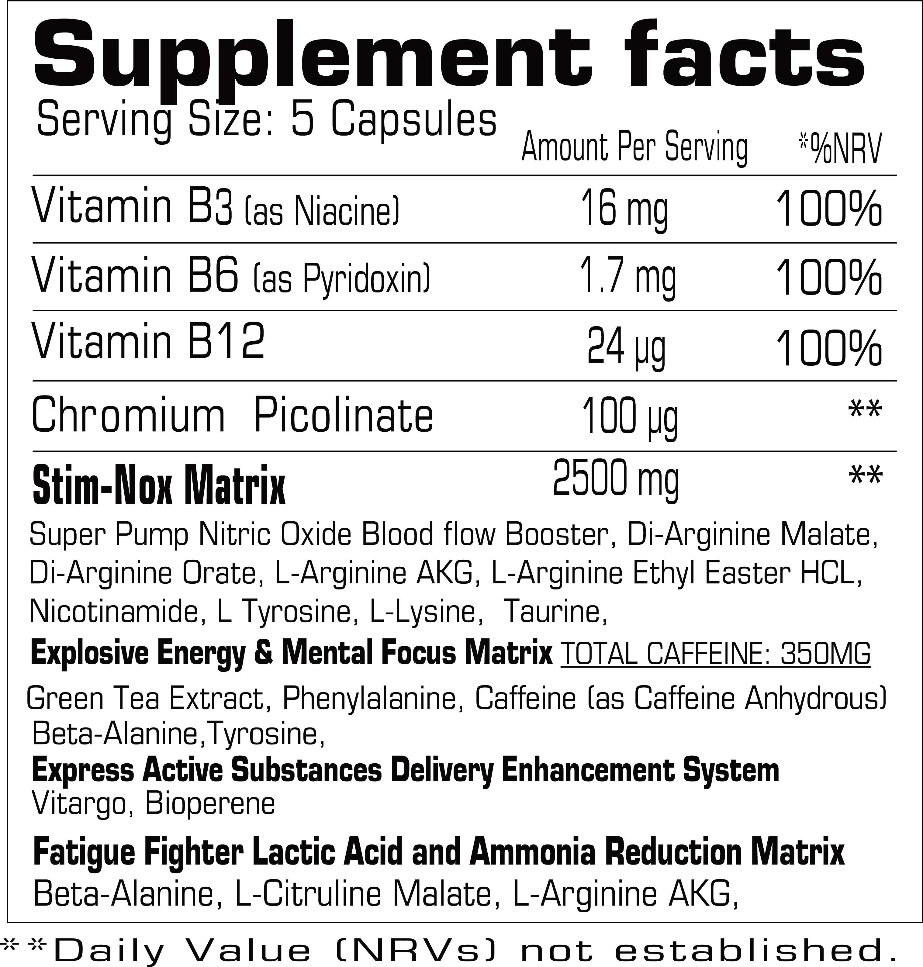 STIM NOX is a high-stimulant, nitric oxide-boosting pre-workout designed to maximize energy, focus, and muscle pumps—while delivering a potent thermogenic effect. Expect explosive, intense workouts that drive lean muscle gains.